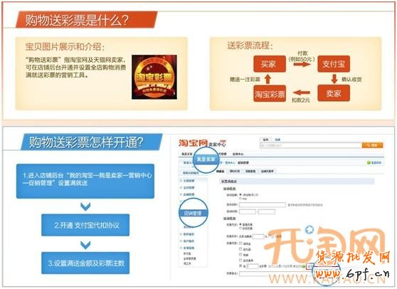 賣家在店鋪后臺“我的淘寶—我是賣家—營銷中心—促銷管理”開通支付寶代扣協議,設置滿送金額及彩票注數。
