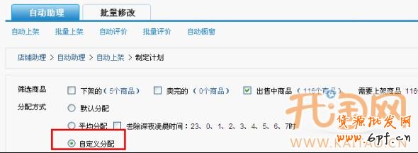 6.或者也可以選擇“自定義分配”,按照寶貝占比來設(shè)置上架時間。如下圖: