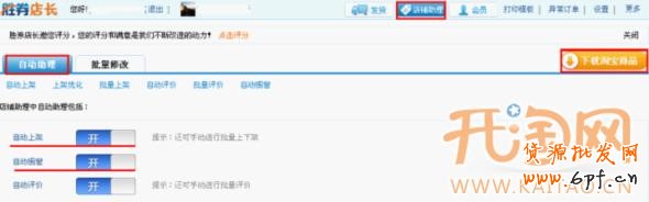 1.打開勝券店長應(yīng)用,可以在右上角“店鋪助理”里面找到本次需要的應(yīng)用“自動助理”。點(diǎn)擊“下載淘寶商品”進(jìn)行寶貝信息更新。保證自動上架為打開狀態(tài)。