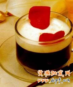 法國人對紅酒的鐘愛猶勝與俄羅斯人對伏特加,巴西人對咖啡。他們不愿意紅酒攙雜任何別的物質(zhì)。Burgundy Coffee卻是一種將紅酒與咖啡融合在一起的花式咖啡。我在想這種咖啡應該是愛浪漫的法國人設計的,因為它的制作過程中充滿了紅色的爛漫。先將鮮奶油與紅酒攪拌一下,然后打沫,打出來后你會發(fā)現(xiàn)紅色的奶沫是那么別有韻味,含蓄卻又充滿了挑逗。在已暖完杯后的馬克杯底先加入一點紅酒,然后將做好的咖啡與砂糖到入(咖啡是意式濃縮咖啡),最后將打好的紅色泡沫放入。一杯浪漫的Burgundy咖啡就做成了。