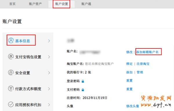 1 登錄支付寶賬戶(www.alipay.com), 點擊【賬戶設置】—【基本信息】—【添加郵箱賬戶名】