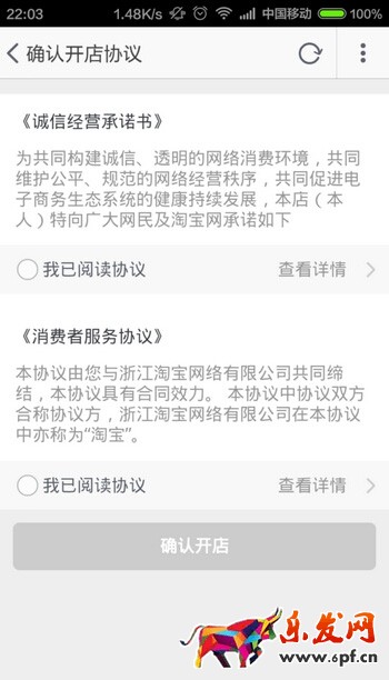 假如你之前是從沒有開過淘寶店的,那么你只需要在下面有“協(xié)議”的界面同意協(xié)議就可以了。跟著點擊最下方的“確認(rèn)開店”按鈕就可以了。