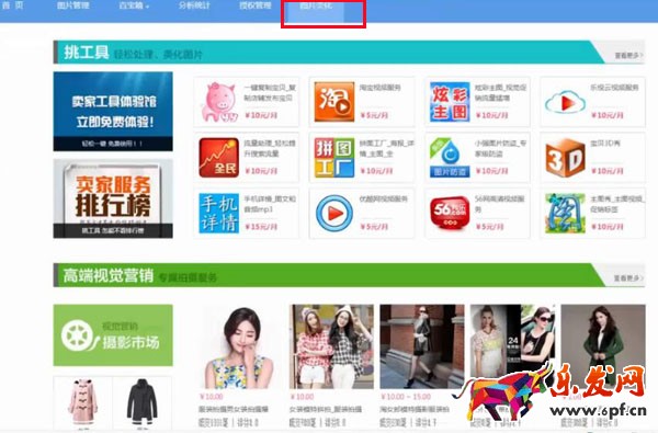 5、點擊【圖片美化】,會進入如下圖所示的頁面,這是處理和購買淘寶工具的頁面,包括一鍵處理寶貝,手機詳情等軟件,若需要購買設置圖片的一些軟件,可以在此購買。