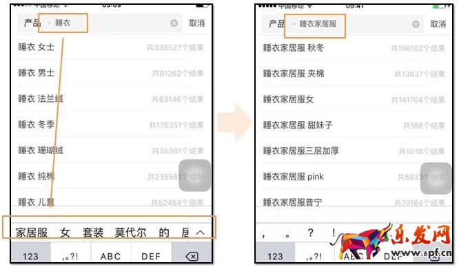 當我們輸入核心詞之后,手機輸入法會有一些相關推薦詞,例如:搜”睡衣“,輸入法會推薦一些和“睡衣”相關的詞,這也是一種組合方法。