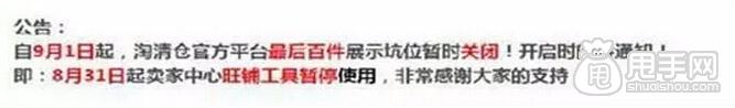 10、淘清倉:淘清倉旺鋪工具暫停公告,自9月1日起,淘清倉官方平臺最后百件展示坑位暫時關閉,開啟時間待通知。即:8月31日起賣家中心旺鋪工具暫停使用!