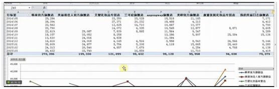 淘寶有個二八法則,80%的營業額都在20%的人手上。要是沒有這個數據,不知道怎樣才能擠進前一百。舉個例子,2014年5月最低的銷量是3700片面膜,如果一個月沒賣到4000片的話,基本上進不了前一百,這就是最初級的目標。想在淘寶占有一席之地就要想辦法打進前一百,這張圖是告訴我們如果要進軍前一百,那我們最低水平要在哪個范圍,淘寶是個相對穩定的市場,每一年變化的數據不會超過一成。我們可以通過去年的情況推斷今年的走勢。一個店鋪想要在淘寶穩定盈利,就必須要了解自己要在這個類目做到什么程度才行。做市場分析就能明明白白把數據擺在那里讓你參考,好處很明顯。