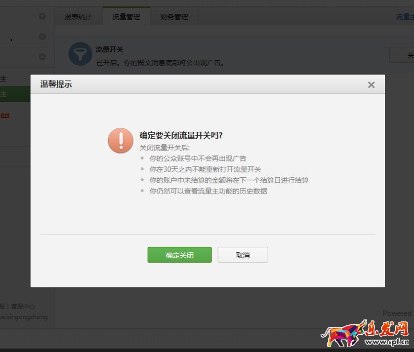 報(bào)表統(tǒng)計(jì)很好理解,重點(diǎn)說一下流量管理。在這里你可以選擇關(guān)閉和開啟廣告。比如,某幾天重要日子,你不想顯示廣告,就可以臨時(shí)停止。如下圖::K%F,ZN"B.X!w]#C