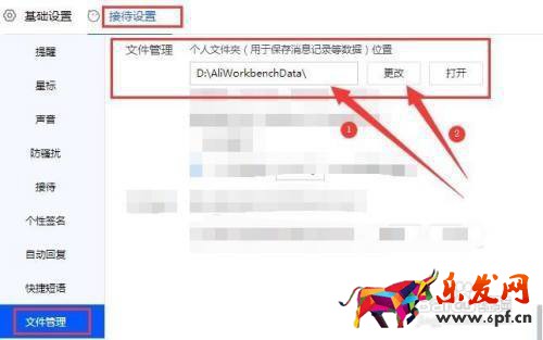 3、進入“接待設置”界面后,在“文件管理”選項中,在“個人文件夾”項下可以看到文件夾存放位置,也可點擊“更改”另行設置位置,如圖所示。