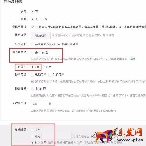 7 選擇付款減庫(kù)存(避免超賣,尤其是天貓店),有效期為7天,返點(diǎn)比例根據(jù)自身情況設(shè)置,最少0.5% (只有天貓店,集市店沒有這一項(xiàng))有根據(jù)具體請(qǐng)款選擇是立即上架還是約定時(shí)間上架,還是放入倉(cāng)庫(kù)。